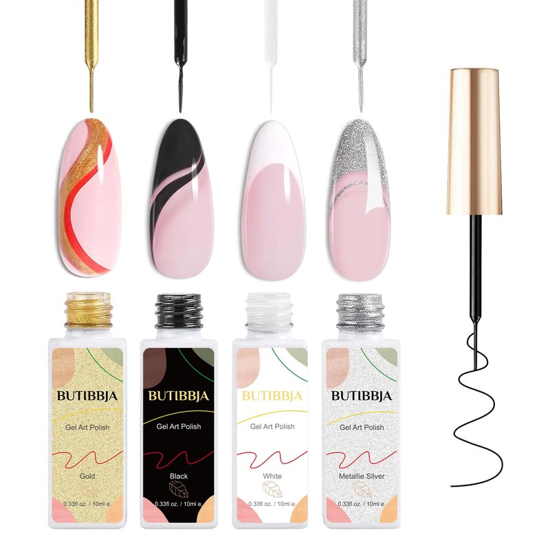 BUTIBBJA Gel Liner Nail Art Polish Set 4 Pcs,Black White Gold Silver Glitters Colors,Gel Nail Art Polish Liners with Thin Nail Art Brush in Bottle,Use with Soak off Led Lamp,Each 0.33fl.oz