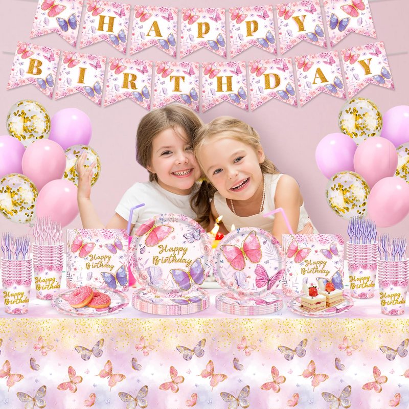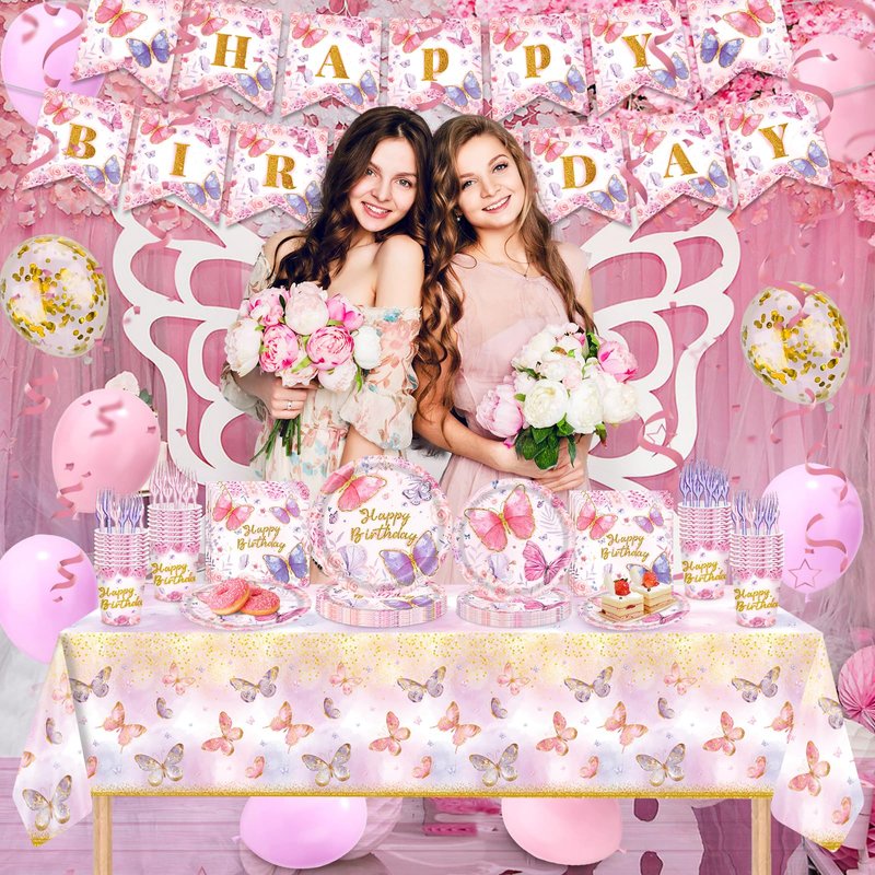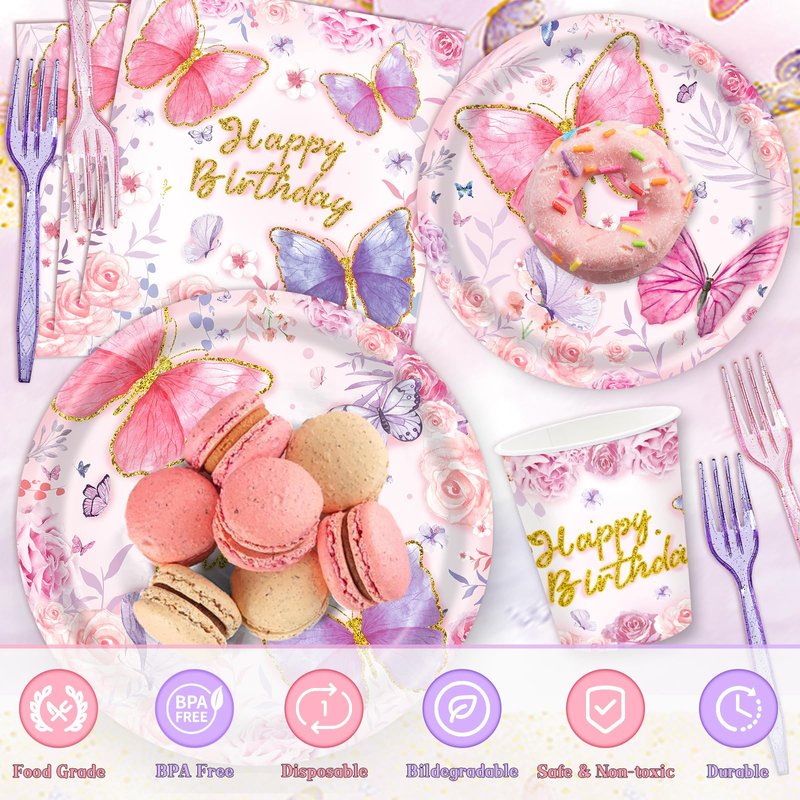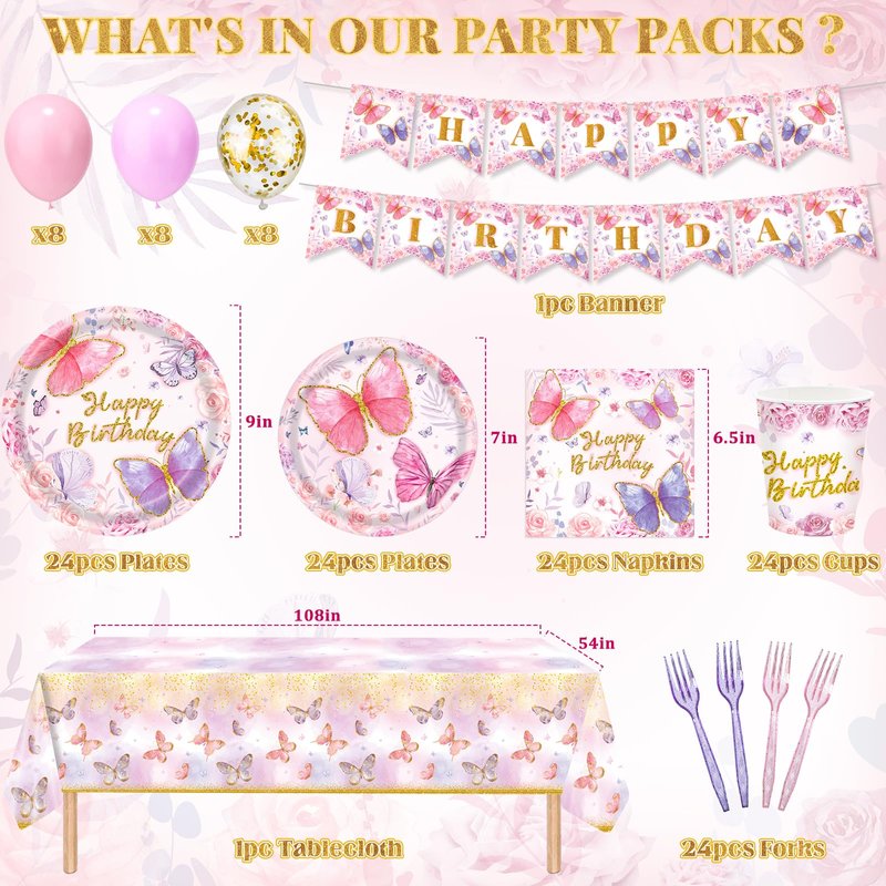 - Butterfly Plates and Napkins-Serves 24: Our butterfly party supplies include 24*9inch plate, 24*7inch palte, 24*forks, 24*napkins, 24*cups, 1* butterfly happy birthday banner, 24* balloons, 1* butterfly tablecloth(137*274cm), a great set for your girl's butterfly party decorations.