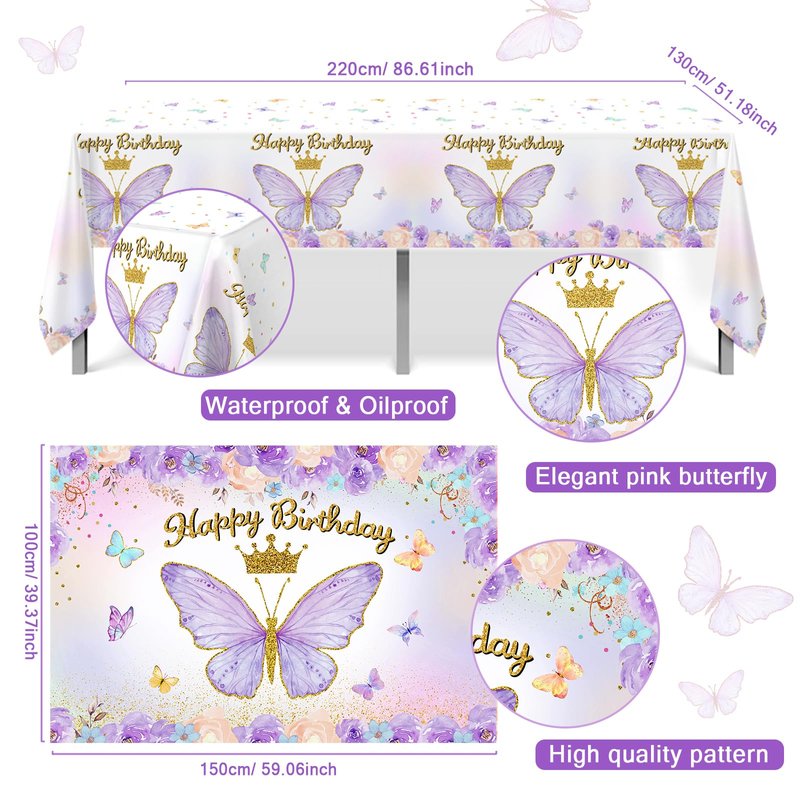 - Banner and Tablecloth - Butterfly backdrop measures 59.06 x 39.37 inches/150x100 cm, purple butterflies and flowers, printed with a large "Happy Birthday"; Disposable butterfly tablecloths measure 86.61 x 51.18 inches/220x130 cm, suitable for up to 24 people, quickly cleaned up after use; birthday banners and butterfly tablecover are made of thick fibers with bright colors and clear printing, perfect decoration kit for a girl's birthday party