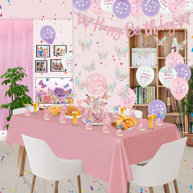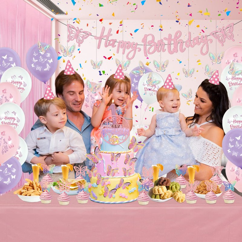- Package Includes - 1 x butterfly happy birthday banner, 18 x latex balloons (6 pink, 6 purple, 6 white), 12 x 3D butterfly stickers, 10 x cake topper, 1 x birthday cake topper, 12 x cupcake topper, 1 x foil fringe curtain, 1 x tablecloth. Use your creativity to create a dreamy butterfly party scene.