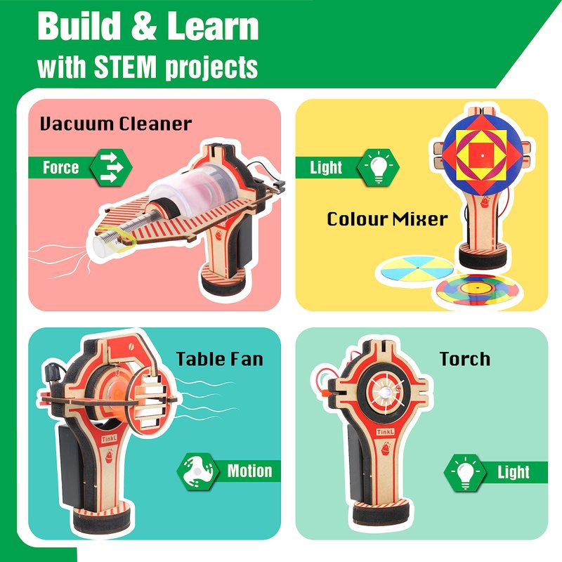 - 7οΈβ£ [ 7in1 Electric Motor Robotic Science Kits ] : MINI GADGET BUILDING STEM TOY - Bring out the inner scientist in your child. Build 7 gadgets in home - 1) Mini Vacuum Cleaner, 2) Color mixer, 3) Massager, 4) Table fan, 5) DIY torch light, 6) Water Sprinker and 7) Egg beater.