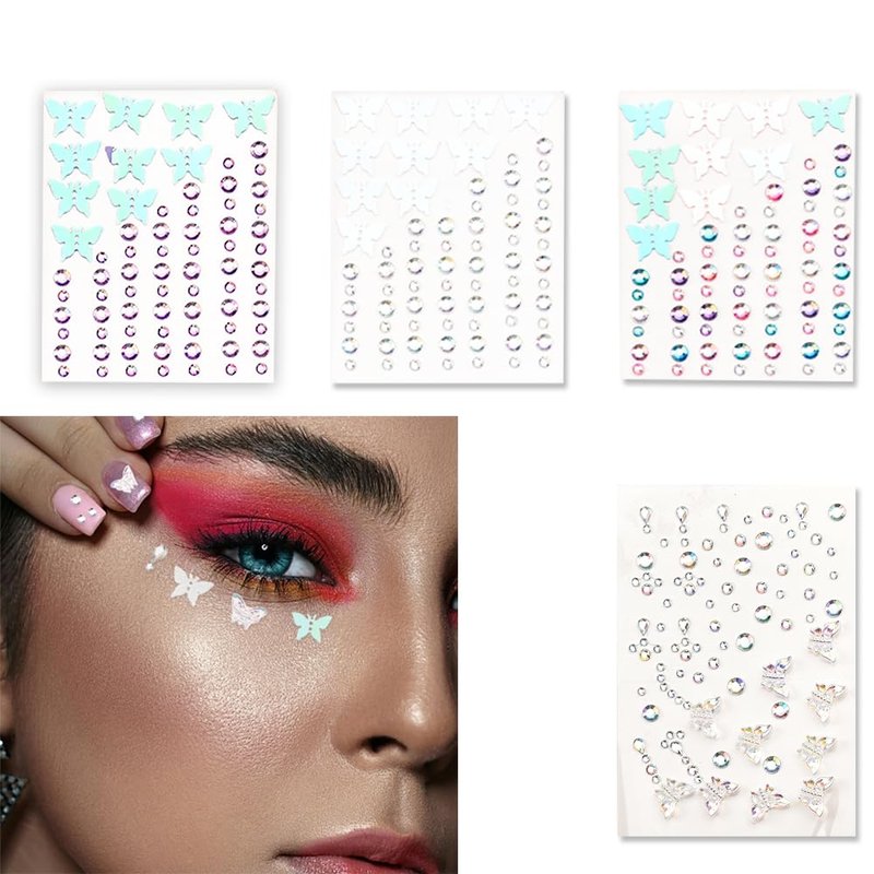 - Face Stickers for Women Makeup Cheerleaders Butterfly Decorations: These rhinestone eye makeup stickers feature intricate butterfly and flower designs that add a touch of elegance and whimsy to your face, nail and body, great as stick on rhinestones for face and hair, face gems for girls makeup festival, absolutely meet your daily needs and add color to your outfit