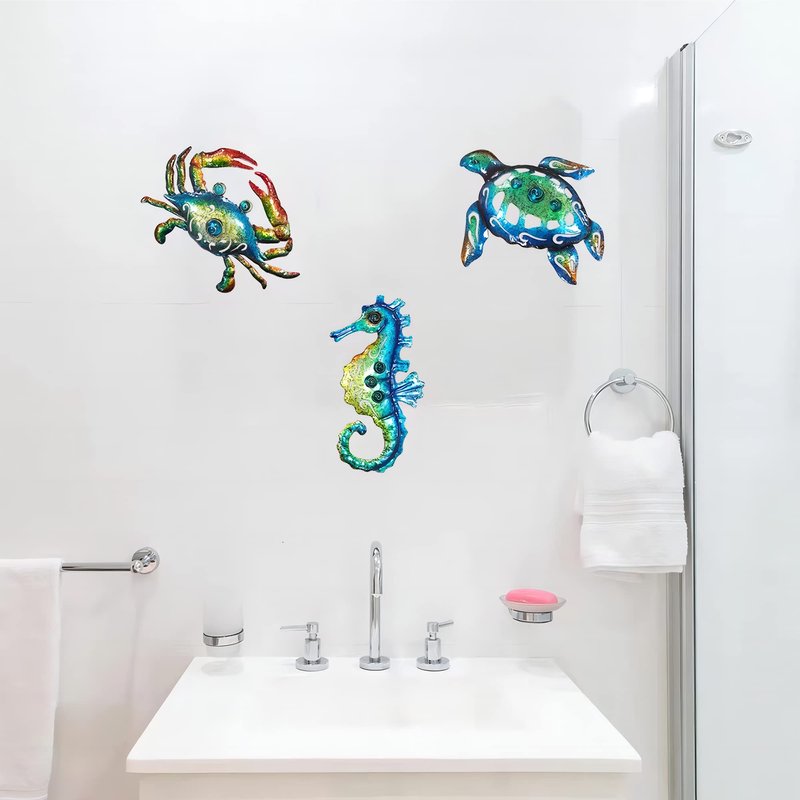 BVLFOOK Metal Sea Turtle Seahorse Crab Beach Themed Bathroom Wall Art Decor, Ocean Themed Wall Decorations for Home Bathroom,10 Inch, Set of 3