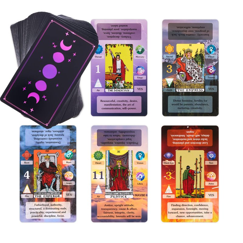 - 【Beautiful Cards Kit】The combination of classic illustrations and meanings, card backgrounds are rich and diverse, and each background pattern can be linked to elements. The design inspiration of each sign is captured from the mysterious universe and witchcraft. Meaningful gift for tarot, witchcraft, divination and Chakra healing lover.