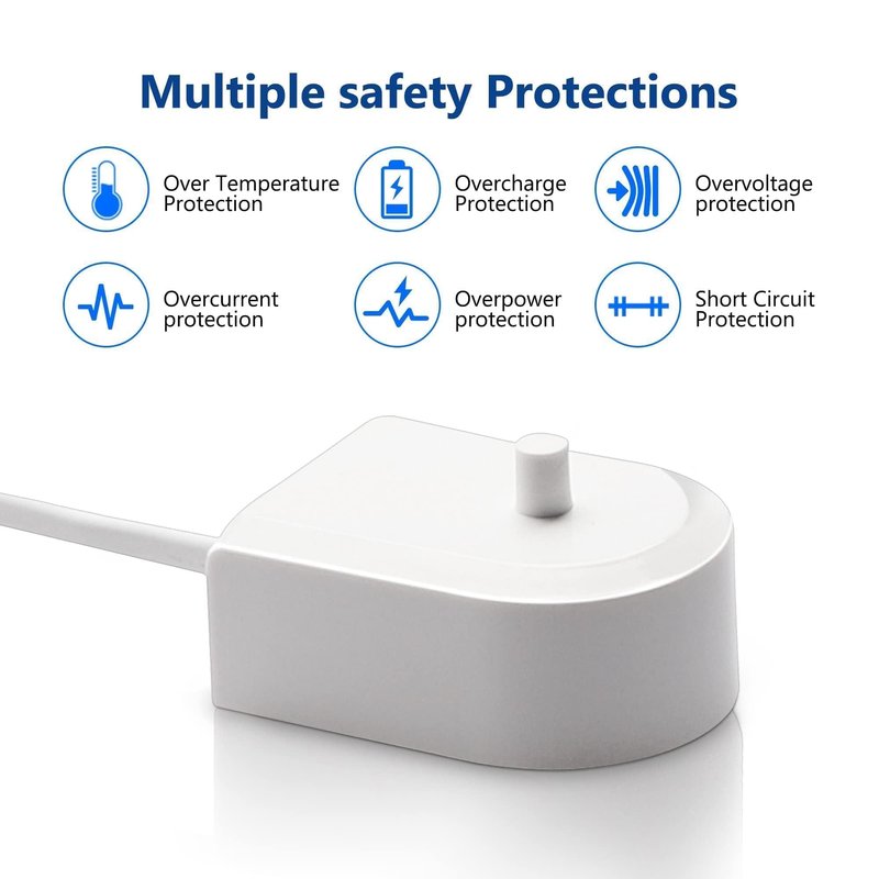 - âĄăSmart ChargingăOur power cord undergo multi tests to ensure safe and available. We guarantee the replacement cord will charge as efficiently as the original charger. all chargers are CE FCC RoHS certified with over-voltage,over-load,over-current,short circuit protection. This electric toothbrush charger base is very easy to use and it is inductively charged. Put it down and charge it, pick up and automatic power off. So you can charger your electric toothbrush more convenient and safer.