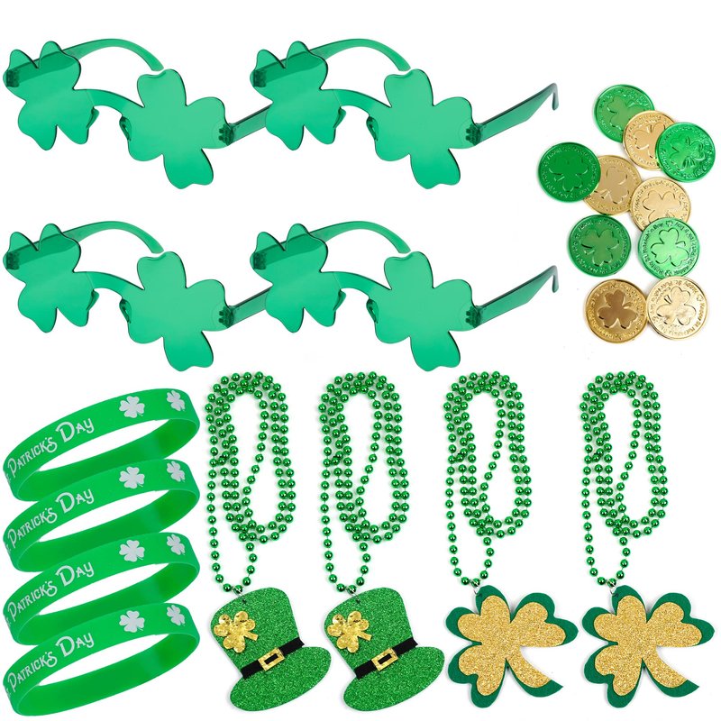 - 🍀Package includes: you will receive 4 pairs of St Patrick's Day glasses, 4 pieces beads necklaces in 2 different styles, 4 pieces silicone wristbands and 10 pieces copper, eough varieties and quantities can meet your holiday decoration needs.