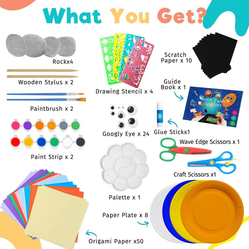 - KID CRAFTS SET:Rock * 4, paint colors * 12(includes 3 glow in the dark paint: blue, yellow, pink), paintbrush * 2, palette * 1, googly eye * 24, scratch paper * 10, wooden stylus * 2, drawing stencil * 4, colourful origami paper * 50, wave edge scissors * 1, craft kids scissors * 1, glue stick * 1, paper plate * 8,guide book * 1.