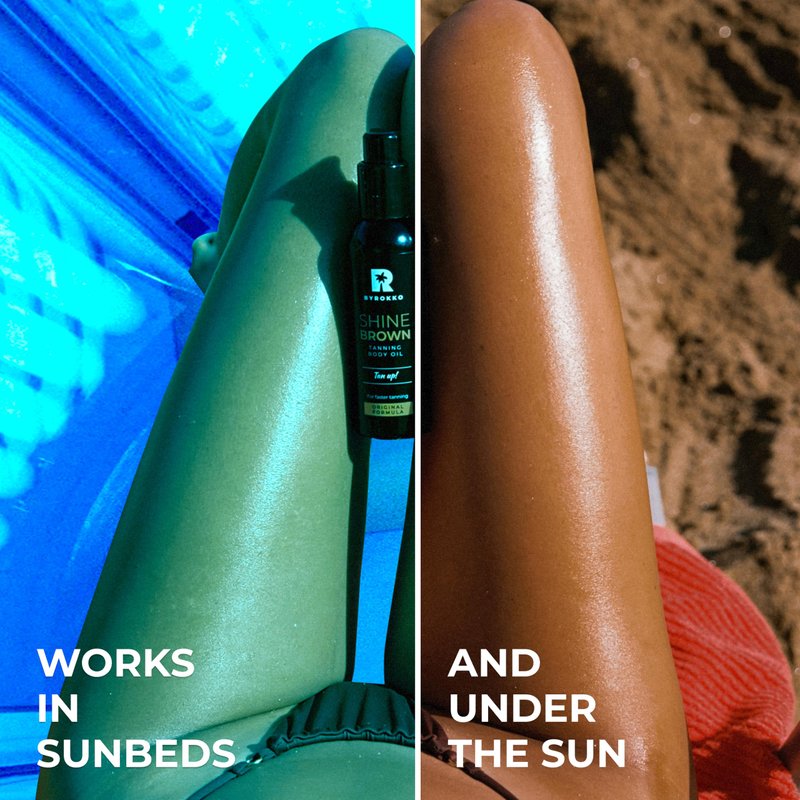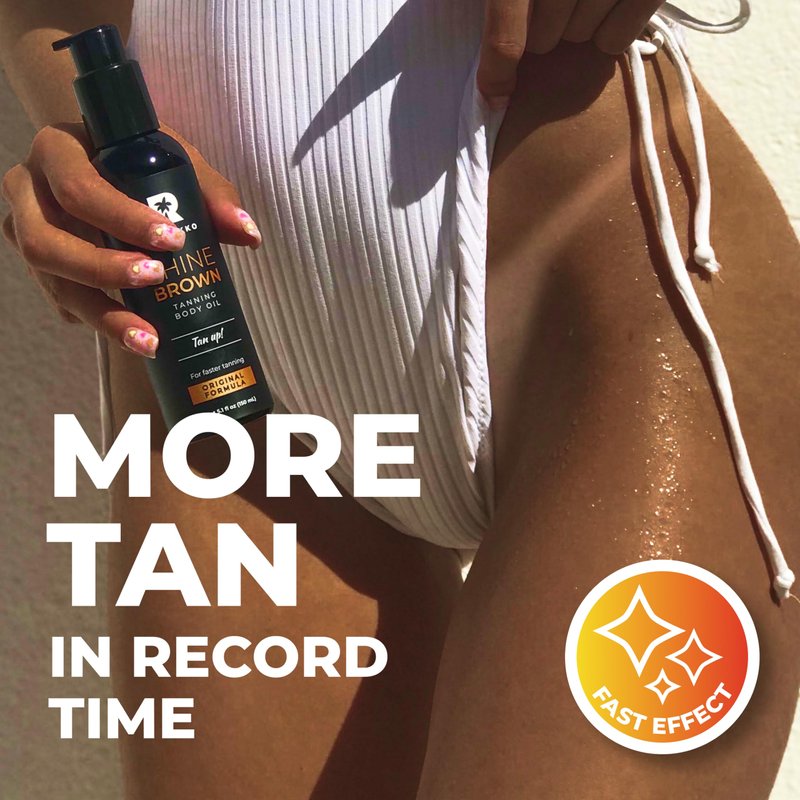 - While it works fast, Shine Brown sun tanning oil moisturizes your skin, allowing it to stay silky smooth and nurtured throughout and after your tanning process. You will see how your skin glows when you apply it but isn’t sticky and absorbs in a matter of seconds. Your skin gets what it needs, even before you start tanning, that’s the secret to beautiful tan.