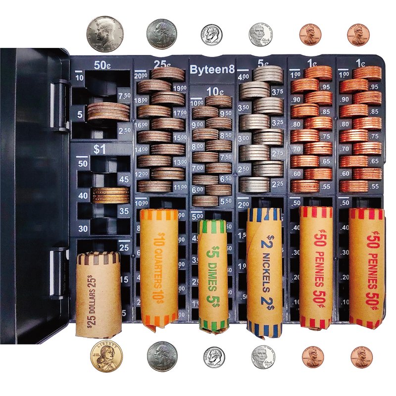 - All Exactly One Roll Design: Byteen8 Self-Counting Coin Tray is Exactly Full Roll Designed. One Roll One Group. Super Easy to Count & Wrapp. Great Money Teaching & Learning Tool for Kids as a Gift. Perfect Loose Change Tray to use with Coin Wrappers.