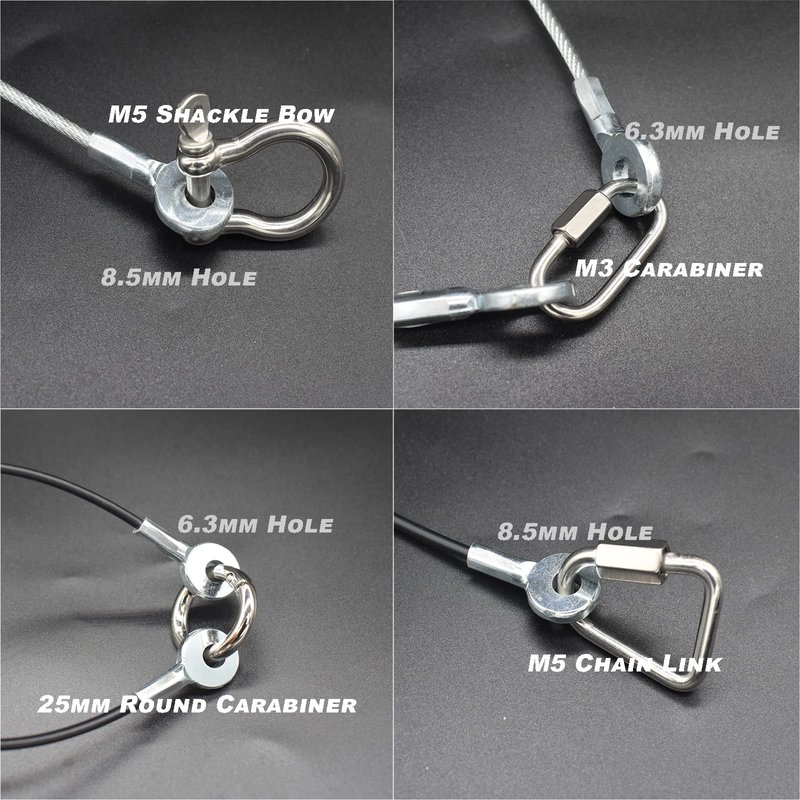 - Galvanized iron round eyelet lock both ends of the cable for hanging and securing. Note: Don't use it for lifting or pulling heavy loads. JUST FOR SECURITY CABLES and hanging light-weight