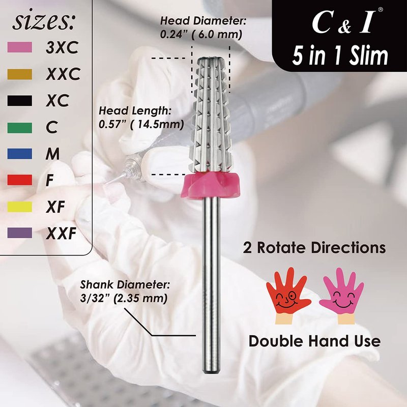 C & I 5 in 1 Nail Drill Bit, Slim Edition, Professional Manicure Drills for Electric Nail Drill Machine (Middle -M)