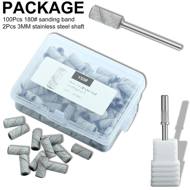 - UPGRADED 3MM SANDING BANDS: Comes with 100Pcs of #150 grit small sanding bands & 2Pcs 3mm small mandrel bit. Create a comfortable manicure experience when removing gel nails, shaping acrylic nails, and blending smooth surfaces.