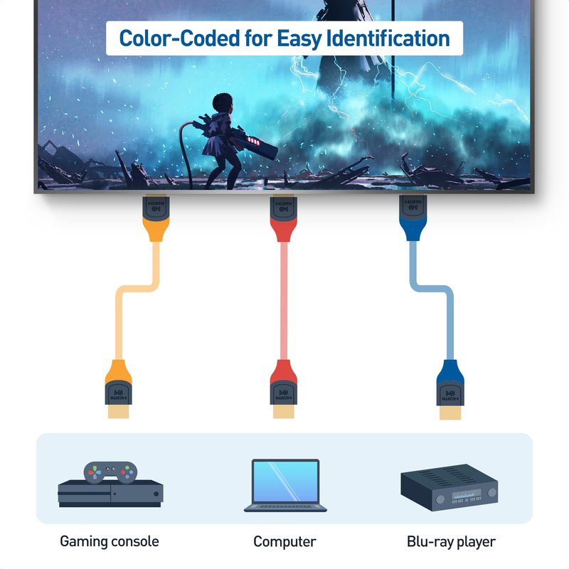 - Color-code & organize your A/V connections with this cost-effective 3-color combo HDMI cable 4K; Easily troubleshoot connection problems with a glance instead of tugging on the HDMI cords to check the connection