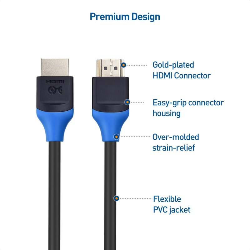 The combination of gold-plated connectors in an easy-grip housing with molded strain relief, bare copper conductors, and foil & braid shielding provides superior cable performance for demanding 4K UHD video and audio streaming.