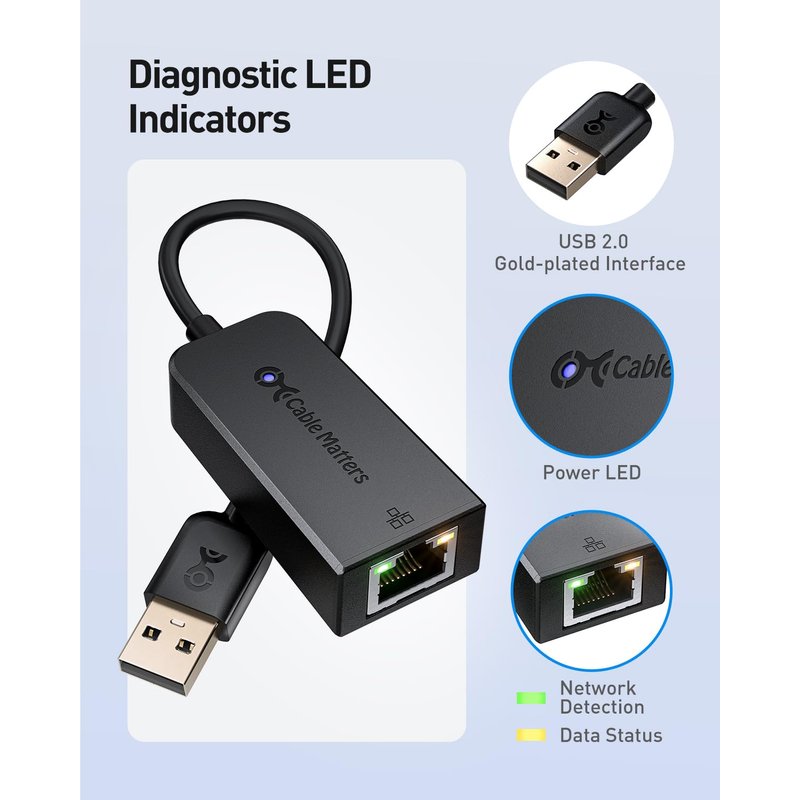 The Cable Matters Hi-Speed USB 2.0 to Fast Ethernet Adapter brings Fast Ethernet connectivity to your Ultrabook, notebook, or tablet with a network connection up to 100 Mbps. This compact and lightweight USB to network adapter is a perfect accessory for file transferring with Fast Ethernet, which is more reliable than wireless network.