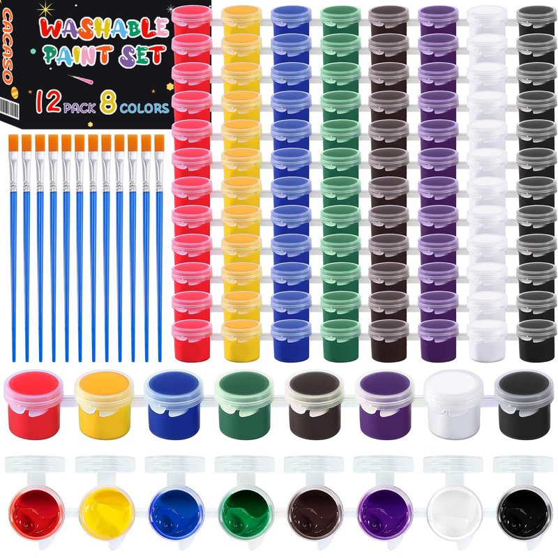 - Wonderful Acrylic Paint Set: Our washable paint set includes12 pack mini acrylic paints with 12 brushes for a total of 108 pieces. Each pack has 8 vibrant classic colors, red, yellow, blue, green, brown, purple, white, black, which you can dilute or mix appropriately to create a variety of colors.