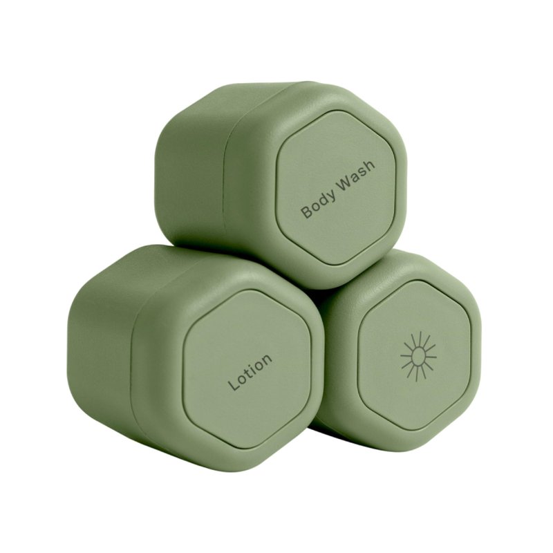 Cadence Travel Containers - Body Care Capsule Set - Magnetic Travel Capsules - For Body Wash, Lotions, Sunscreens - 3 Flex Mediums (1.32oz) with Body Wash, Lotion, & Sun Icon Labels - Eucalyptus