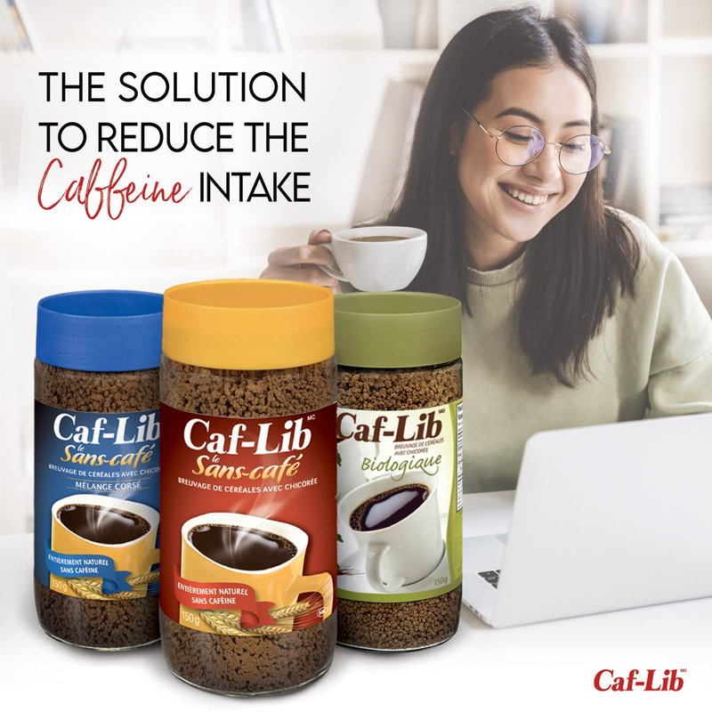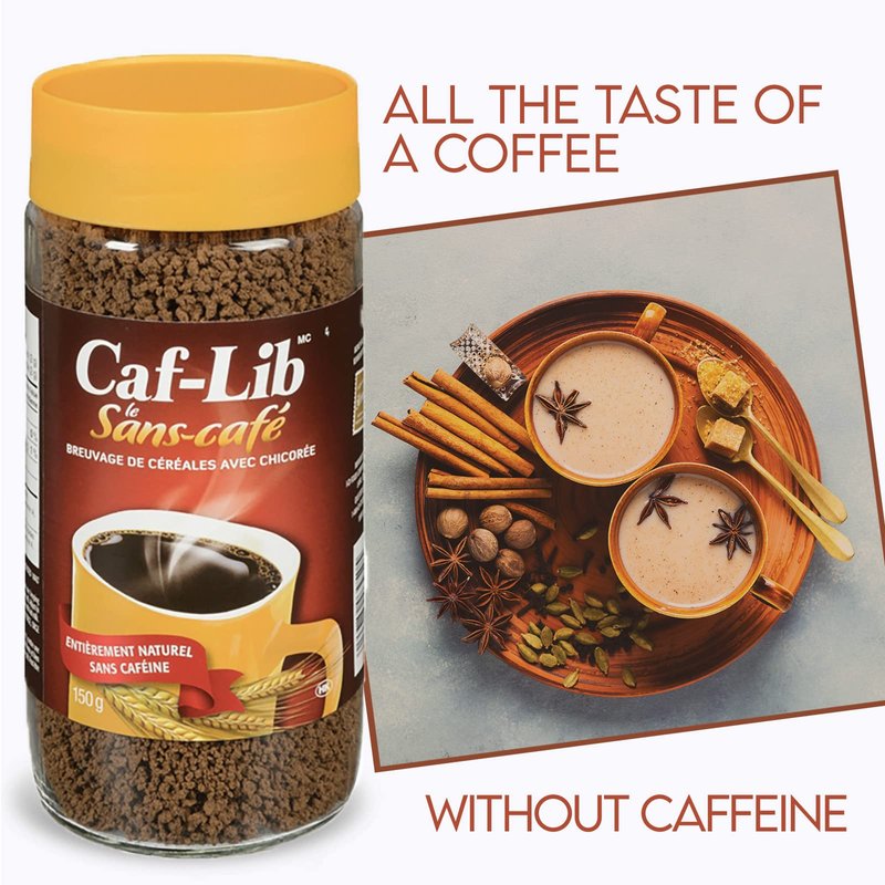 Coffee alternative made from roasted barley and chicory with a smooth, rich flavour. 100-Percent natural, free of caffeine, chemicals and preservatives, Caf-Lib addresses the following conditions; high blood pressure, pregnancy, insomnia, sleeplessness, caffeine intolerance. Unlike decaffeinated coffee or tea which still contains some caffeine, Caf-Lib lets you rest easy. Have it any time of day, even at bed time. Enjoy all the pleasures of a coffee break, minus the caffeine. You probably drink more coffee than you think. Replace a mid-morning coffee with a No Caffeino Cappuccino."Caf-Lib is not decaffeinated: it is made from ingredients that never had caffeine to begin with. Thanks to superior manufacturing and packaging practices which ensure its microbiological integrity, Caf-Lib requires no preservatives to maintain its freshness. The taste of Caf-Lib Original is similar to instant coffee. Our Dark Roast offers a more robust flavour to please people who prefer a stronger brew. As for our Organic blend, its taste resembles our Original blend. Coffee alternative made from roasted barley and chicory with a smooth, rich flavour. Naturally caffeine-free. All-natural, no preservatives. Also available in Dark Roast and Organic. Kosher"
