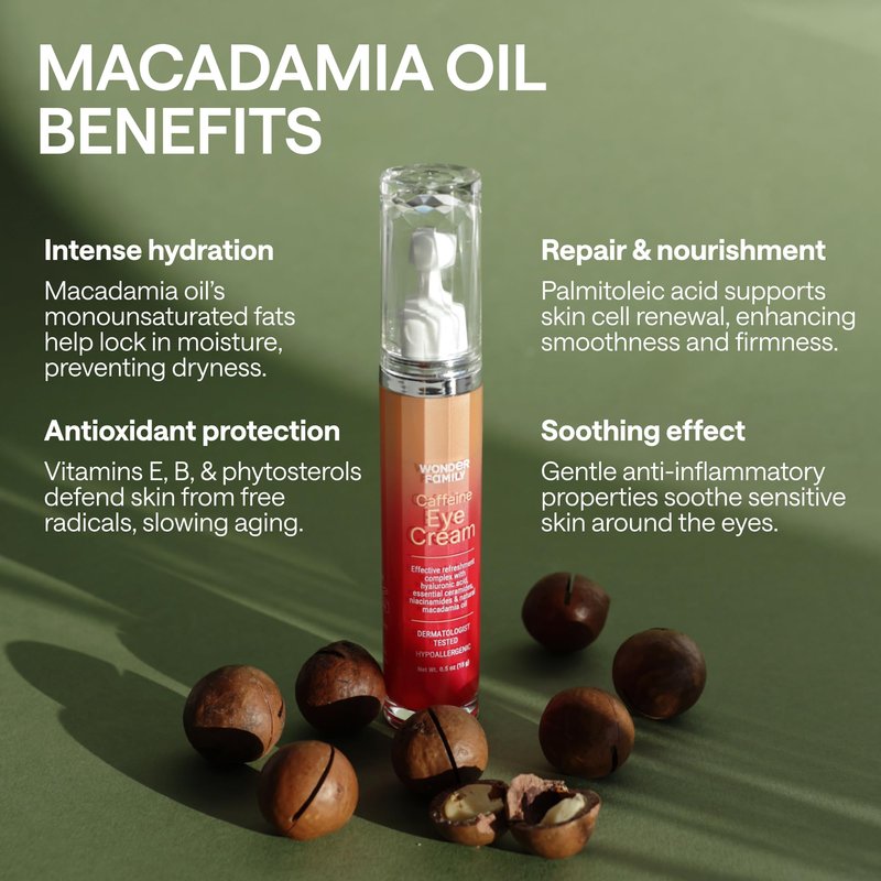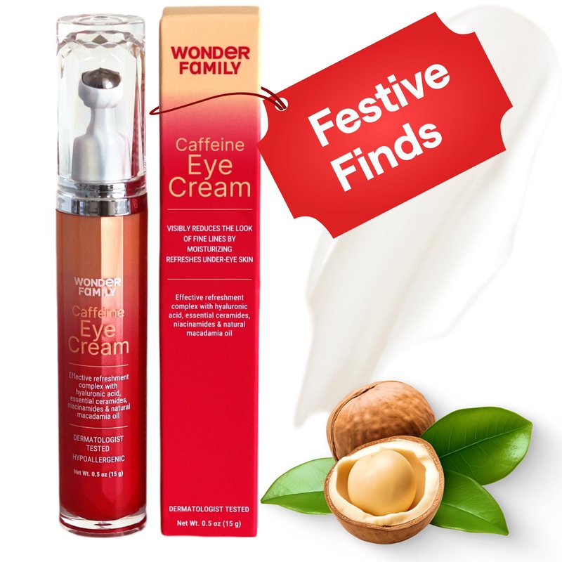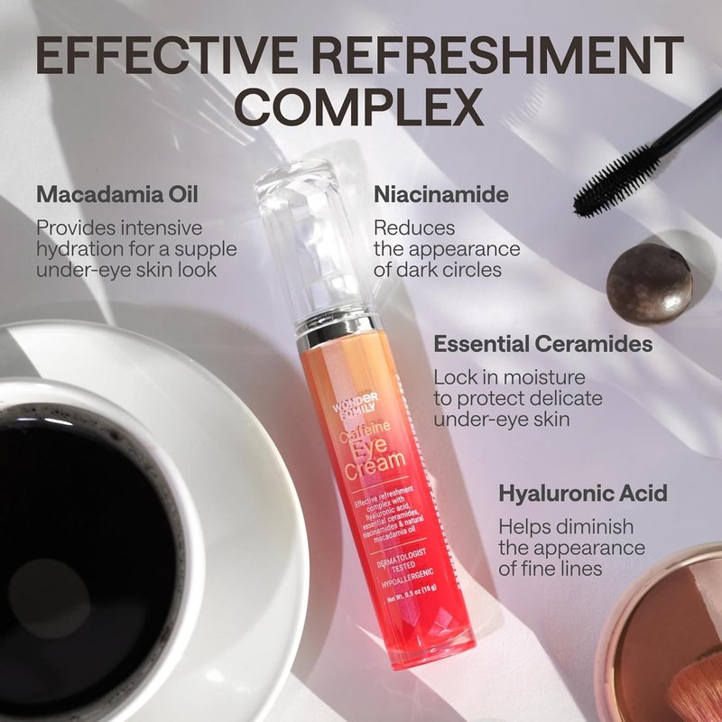 Say goodbye to dark circles, puffiness, and tired-looking eyes with our potent eye serum caffeine formula. This revitalizing caffeine eye stick combines the invigorating effects of caffeine with nourishing ingredients to brighten, hydrate, and revitalize your delicate eye area. Our unique coffee eye cream, formulated as a luxurious eye balm, acts as a dark circle corrector to diminish the appearance of dark circles and brighten the under-eye area. Experience the power of caffeine as a natural eyebag remover with this effective eye bag cream that helps to de-puff and reduce under-eye bags for a more refreshed appearance. This multi-tasking eye serum for dark circles and puffiness also functions as a restorative under eye serum, working its magic while you sleep. Used as a nightly hydrating eye cream with caffeine or night eye cream, it nourishes the delicate skin around your eyes, minimizing the appearance of fine lines and wrinkles. Prefer a quicker application? You can also use it as a revitalizing eye brightening cream throughout the day. Many users love using it as a puffy eye cream and gently massaging it into the under-eye area to reduce puffiness and bags. This luxurious eye stick, designed to apply like an eye balm stick, makes application a breeze! Whether you prefer a rich and creamy eye balm, a potent dark eye circle remover treatment, a quick and easy eye stick application, a deeply moisturizing eye moisturizer, or a deeply hydrating depuffing eye serum, our cream for eye bags formula delivers powerful, visible results. For an added touch of luxury, apply with our cooling eye serum roller. Try and see the difference with Wonder Family's Under Eye Cream for puffiness and bags.