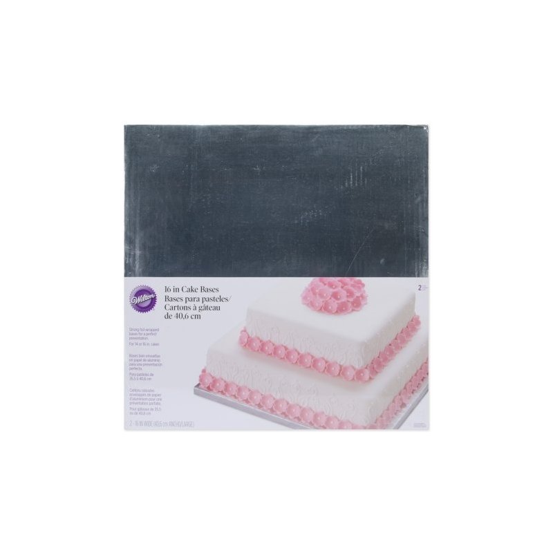 This is a package of 16" square silver cake boards. There are two boards per package.