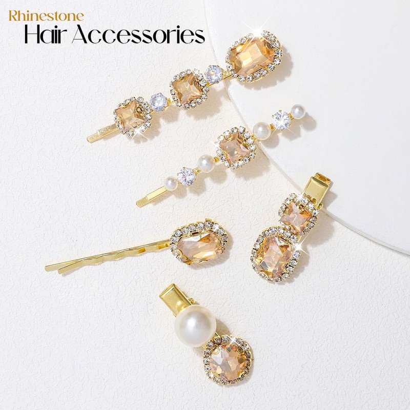 CAKURE Rhinestone Hair Clips Gold Champagne Crystal Hairpins Pearl Hair Barrettes Gift Decorative Hair Accessories for Women and Girls 5PCS