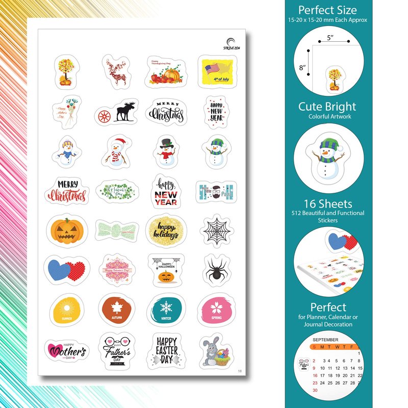 Calendar Planner Stickers by StriveZen, Planner Stickers Pack, 512 Cute Stickers, 16 Sheets, Birthday, Self Expression, Doctor Appointment, Productivity, Holiday, Budget, Travel, Health, Daily Chores