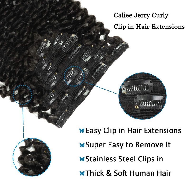 - 2.【Jerry Curly Clip in Hair Extension】Jerry curly is very beautiful and fashionable! They are all clip in human hair extensions, which looks very natural like your own hair. Very easy to wear and remove.