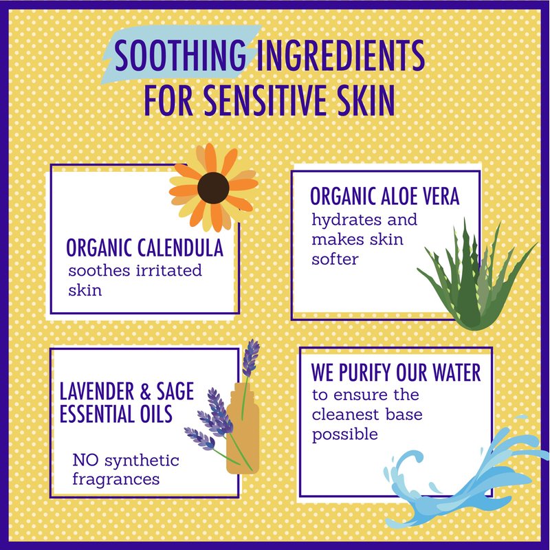 Nourish sensitive skin of all ages with soothing calendula and aloe vera. Fans love the light, calming scent from French lavender and clary sage essential oils.