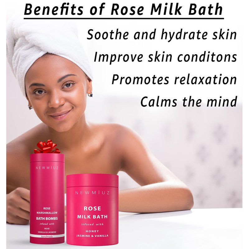 New Miuz's premium luxury creamy rose milk bath soak powder gift set is highly effective in maintaining younger and silky soft skin. The perfect way to take care of your asking and relax and unwind! Best gift for women. Rich in creamy milk, . Our effective milk bath formula will surprise you! We use only the highest quality ingredients to create the purest and most effective milk bath products in the USA today.