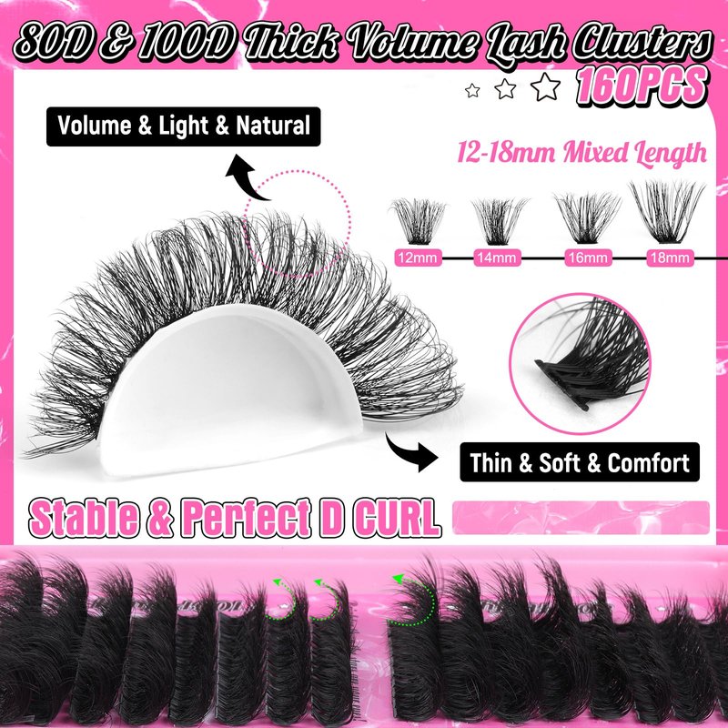 Include: Fluffy 80D+100D volume cluster eyelash extensions 160pcs, D curl, 12-18mm mixed length, strong hold lash bond and seal *1, gentle lash remover *1, precision lash tweezers *1.