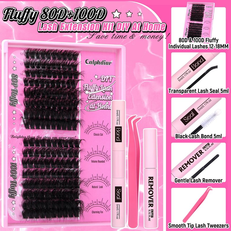 - 【80D&100D Lashes Extension Kit】Fluffy eyelash clusters kit comes with volume cluster lashes, strong hold lash bond and seal, easily remove lash remover, lash tweezers. Calphdiar eyelashes kit has everything you need to DIY lash extensions