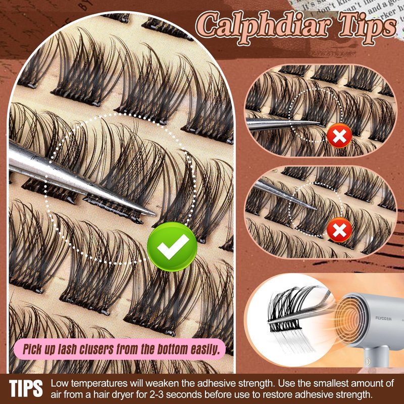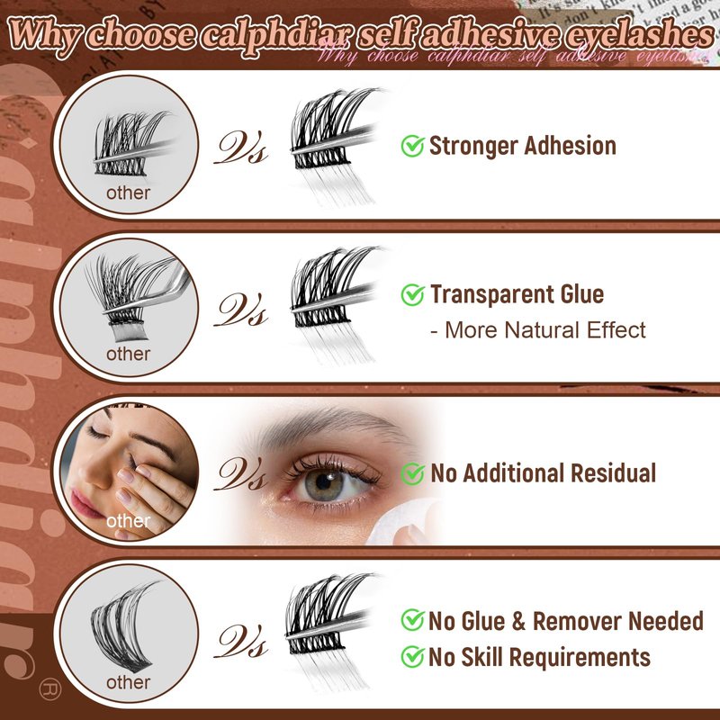 - 【Lash Clusters with Clear Self-adhesive Strips】Compared to individual eyelashes that require glue or come with black adhesive strip. calphdiar self adhesive lash extensions with transparent glue strips are more natural, durable and convenient