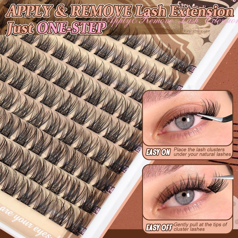 - 【No Glue & No Remover】 Self adhesive lashes clusters are applied or removed in 1 step, just 30s, stick eyelash extension on or go. Self adhesive diy lash extension kit, there is no need to wait for glue to dry and remove, saving your valuable time