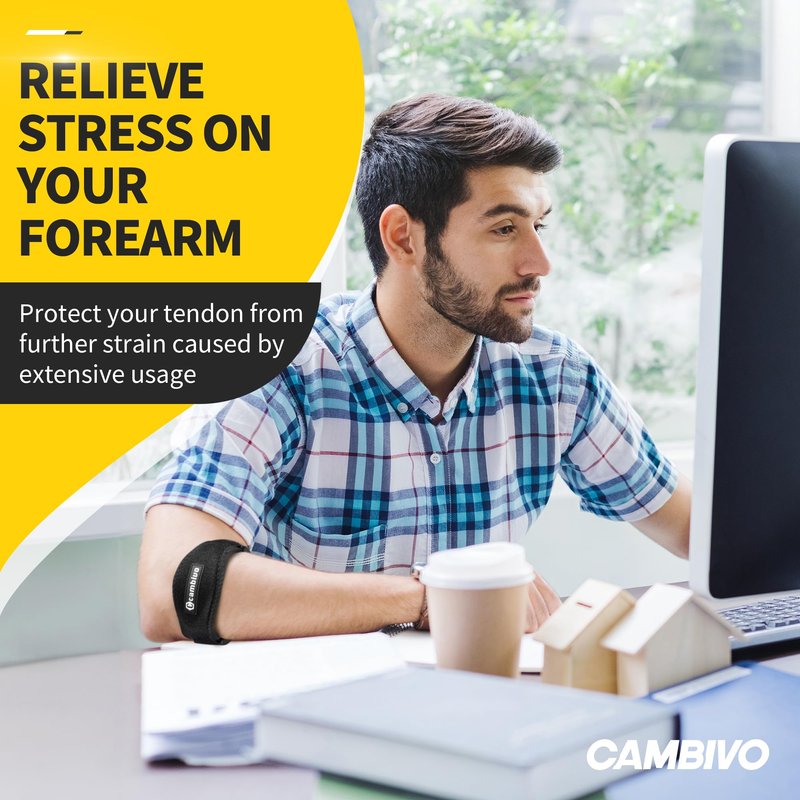 - Professional Elbow Protection: Cambivo tennis elbow strap can help to prevent injuries from tendonitis and Tennis Elbow, relieving various pain and elbow discomforts by applying proper compression to the upper forearm and redirects the stressful forces away from the area with the support cushion; Suitable for people who perform repetitive arm, wrist and elbow movements, even movements caused by computer mouse use