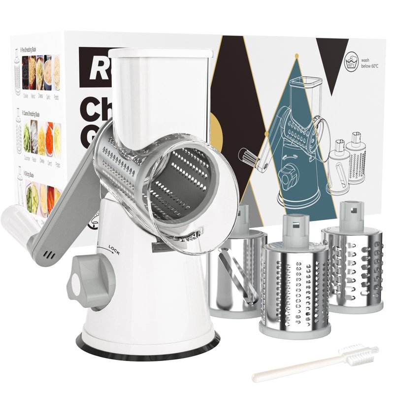 Cambom Rotary Cheese Grater Hand Crank Cheese Shredder for Fresh Cheese, Vegetable, Nuts,Non-slip Suction Base, Free Cleaning Brush Three Blades, White