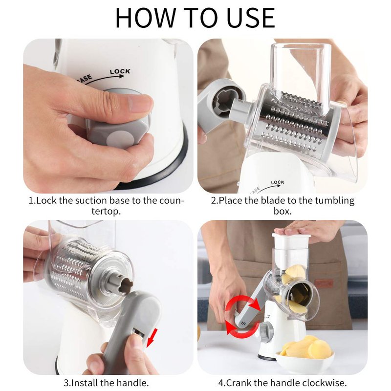 - Three Blades: Coarse shredding blade, fine shredding blade with different diameter ; One slicing blades; A pound of cheese is only 30 seconds, avoid contact between fingers and blades