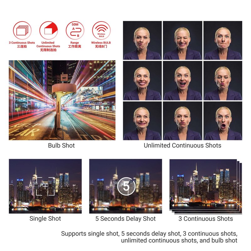 - [5 Shooting Modes]- By using this remote control, five shooting modes can be achieved: single shot, 5 seconds delay shot, 3 continuous shots, unlimited continuous shots, and bulb shot. Additionally, the transmitter is able to fire multiple receivers at the same time (Attention: It does not control video Start/Stop)
