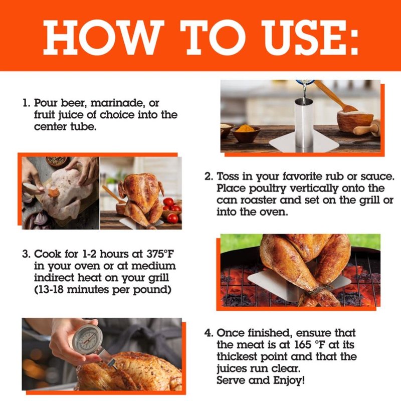 - Each beer can chicken stand roaster comes with instructions and recipes for dry rubs, making this an excellent present for that grill lover in your life! Great and unique gift idea for the holidays, birthdays, or any other special occasion!