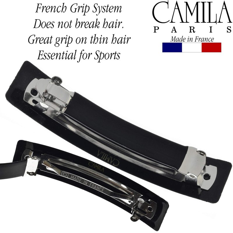 Camila Paris AD820 Size 3.6 inch French Hair Accessories, Hair Barrettes Black. Strong Hold No Slip Grip for Women and Durable Styling Girls Hair Ornaments. Made in France with Cellulose Acetate. With its beautiful and timeless designs featuring styles as hair barrettes for women, hair clips, ponytail holders, hair bananas, headbands, Hair pins, and more, decorated with unique designs, prints, and patterns. Handmade pieces are ideal for special occasions and include a large selection of hair ornaments for everyday use. We count with innovative features such as French Grip System ideal for fine hair, Spring Cover no visible hinge, Grip Link hinge replaced for a durable rubber band that holds better and maintain the due hair for all day. Camila Paris collection are for all hair types, fashion hair clip tools for black brown dark light brunette blondes red heads; use for adults with curly wavy straight frizzy fine thin long medium mid back shoulder length hairstyle; cutting curling coloring drying or straightening. Camila Paris 20 years of professional experience and products knowledge, a high quality hair ornaments line. A staple of excellence in the hair accesories industry