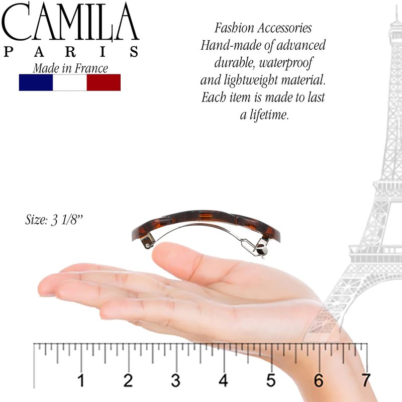 Camila Paris CP2425 Size 3.12 inch French Hair Accessories, Barrettes Tortoise. Strong Hold No Slip Grip for Women and Durable Styling Girls Hair Ornaments. Made in France with Cellulose Acetate. With its beautiful and timeless designs featuring styles as hair barrettes for women, hair clips, ponytail holders, hair bananas, headbands, Hair pins, and more, decorated with unique designs, prints, and patterns. Handmade pieces are ideal for special occasions and include a large selection of hair ornaments for everyday use. We count with innovative features such as French Grip System ideal for fine hair, Spring Cover no visible hinge, Grip Link hinge replaced for a durable rubber band that holds better and maintain the due hair for all day. Camila Paris collection are for all hair types, fashion hair clip tools for black brown dark light brunette blondes red heads; use for adults with curly wavy straight frizzy fine thin long medium mid back shoulder length hairstyle; cutting curling coloring drying or straightening. Camila Paris 20 years of professional experience and products knowledge, a high quality hair ornaments line. A staple of excellence in the hair accesories industry