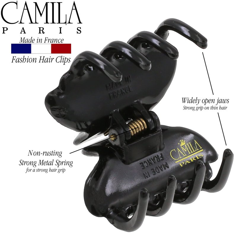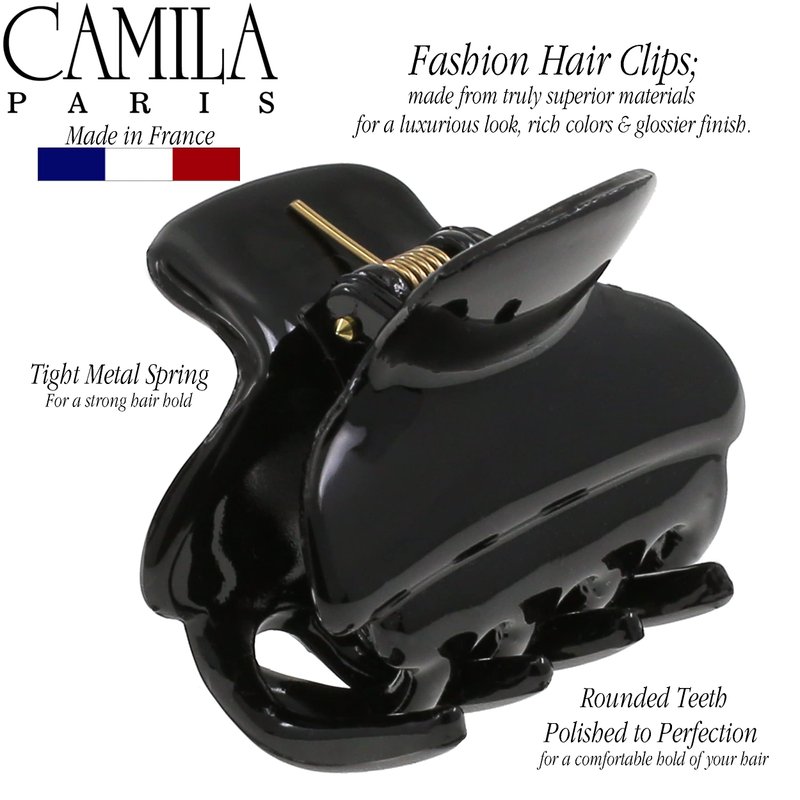 Camila Paris CP3554 Size 2 inch French Hair Accessories, Hair Claw Clamp Clips. No Pulling or Damage. Strong Hold No Slip Grip for Women and Durable Styling Girls Hair Ornaments. Made in France with Cellulose Acetate. With its beautiful and timeless designs featuring styles as hair barrettes for women, hair clips for girls, ponytail holders, hair banana clip, headbands, Hair pins, and more, decorated with unique designs, prints, patterns and finishes like black, Black, decoration and colors. Hand-made pieces are ideal for special occasions and include a large selection of hair ornaments for everyday use. We count with innovative features such as French Grip System ideal for fine hair, Spring Cover no visible hinge, Grip Link hinge replaced for a durable rubber band that holds better and maintain the due hair for all day. Camila Paris collection are for all hair types, fashion hair tools for black brown dark light brunette blondes red heads; use for adults with curly wavy straight frizzy fine thin long medium mid back shoulder length hairstyle; cutting curling coloring drying or straightening. Camila Paris 20 years of professional experience and products knowledge, a high quality hair ornaments line. A staple of excellence in the hair accesories industry