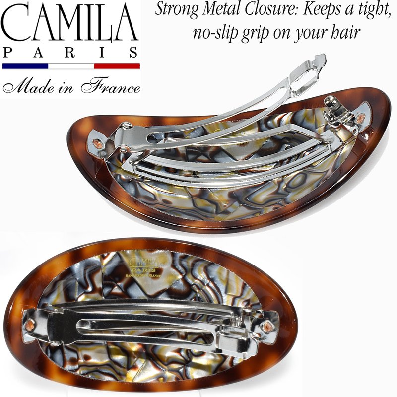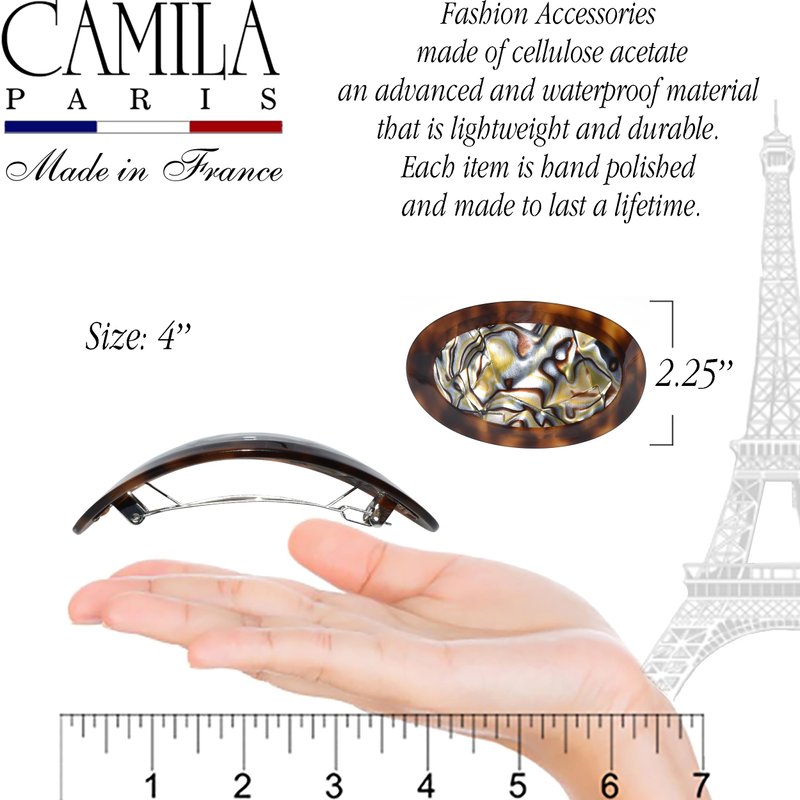 Camila Paris CP3644 Size 3.5 Inch French Hair Accessories Barrettes Largel Brown and Onyx. Strong Hold No Slip Grip with No-Slip Rubberized Automatic Metal Clasp for Women & Durable Styling Girls Hair Ornaments. Made in France with Cellulose Acetate from an acetate sheet for a luxurius look, rich colors & glossier finish. With its beautiful and timeless designs featuring styles as hair barrettes, hair clips, ponytail holders, hair bananas, headbands, Hair pins, and more, decorated with unique designs, prints, and patterns. Handmade pieces are ideal for special occasions and include a large selection of hair ornaments for everyday use. We count with innovative features such as French Grip System ideal for fine hair, Spring Cover no visible hinge, Grip Link hinge replaced for a durable rubber band that holds better and maintain the due hair for all day. Camila Paris collection are for all hair types, fashion hair tools for Brown and Onyx Brown and Onyx dark light brunette blondes red heads; use for adults with curly wavy straight frizzy fine thin long medium mid back shoulder length hairstyle; cutting curling coloring drying or straightening. Camila Paris 20 years of professional experience and products knowledge, a high quality hair ornaments line. A staple of excellence in the hair accesories industry