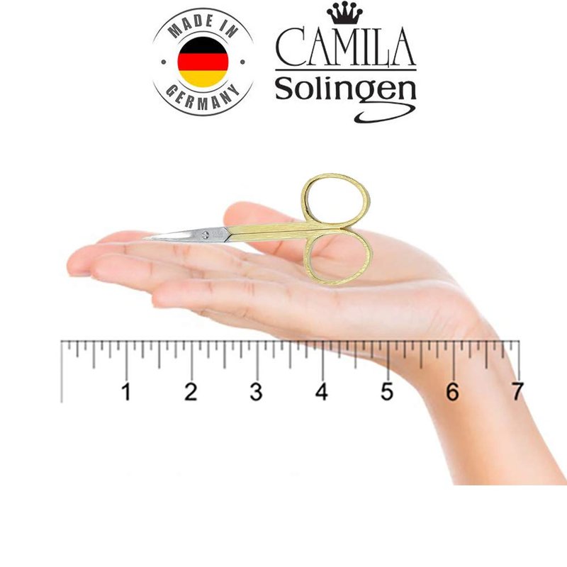 Camila Solingen CS05 3.5 Inch Professional Nail Cuticle Scissors modern style gold plated hypoallergenic. Pedicure / manicure cuticle cutter scissors made of high quality Solingen, German stainless steel which assures a long lasting cutting edge. Designed for a greater comfort and smoother cutting action, this Solingen, German Stainless Steel construction eliminates the worry that the device will rust, with ultra sharp surgical grade, stainless steel tip nips. Extra fine, sharp blades permitting a precise cut. A slim, sleek ergonomic design enhanced with a stunning gold and chrome silver finish brings comfort and pleasure with each use. Camila Solingen is trusted globally by professional nail beauty technicians as well as home users to create a perfect manicure and pedicure. Durable and anti-corrosive tools hand crafted in Solingen, Germany with premium stainless steel.Modern Style Gold Plated pedicure / manicure cuticle cutter scissors are made of high quality Solingen, German stainless steel which assures a long lasting cutting edge. Designed for a greater comfort and smoother cutting action Solingen, German Stainless Steel construction eliminates the worry that the device will rust with ultra sharp surgical grade, stainless steel tip nips. Extra fine, sharp blades permitting a precise cut. A slim, sleek ergonomic design enhanced with a stunning gold and chrome silver finish brings comfort and pleasure with each use. Camila Solingen is trusted globally by professional nail beauty technicians as well as home users to create a perfect manicure and pedicure. Durable and anti-corrosive cuticle tools.