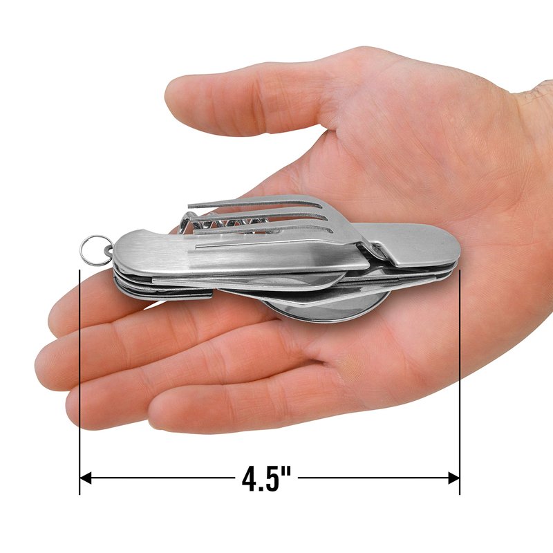 Camillus Camp Set: Collapsible Cup 5 ounce Stainless Steel Flask Multi-Tool Fork: Corkscrew, Bottle and Can Opener Multi-Tool Spoon: Leather Punch, Knife.