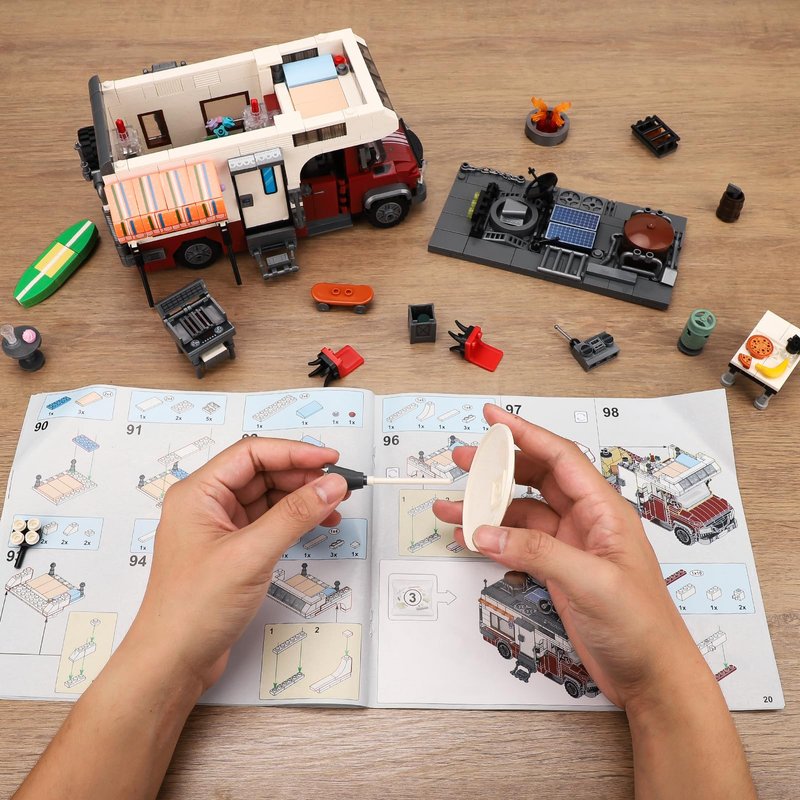 - 【Exquisite RV Camper Car Details】 The camper building block set has exquisite details and accessories, including tables and chairs, campfires, grills, drinks.The rich accessories add more fun and interesting functions to the set, and highly restore the camping atmosphere