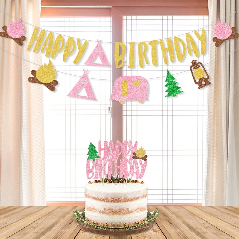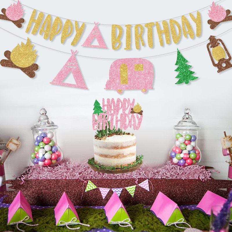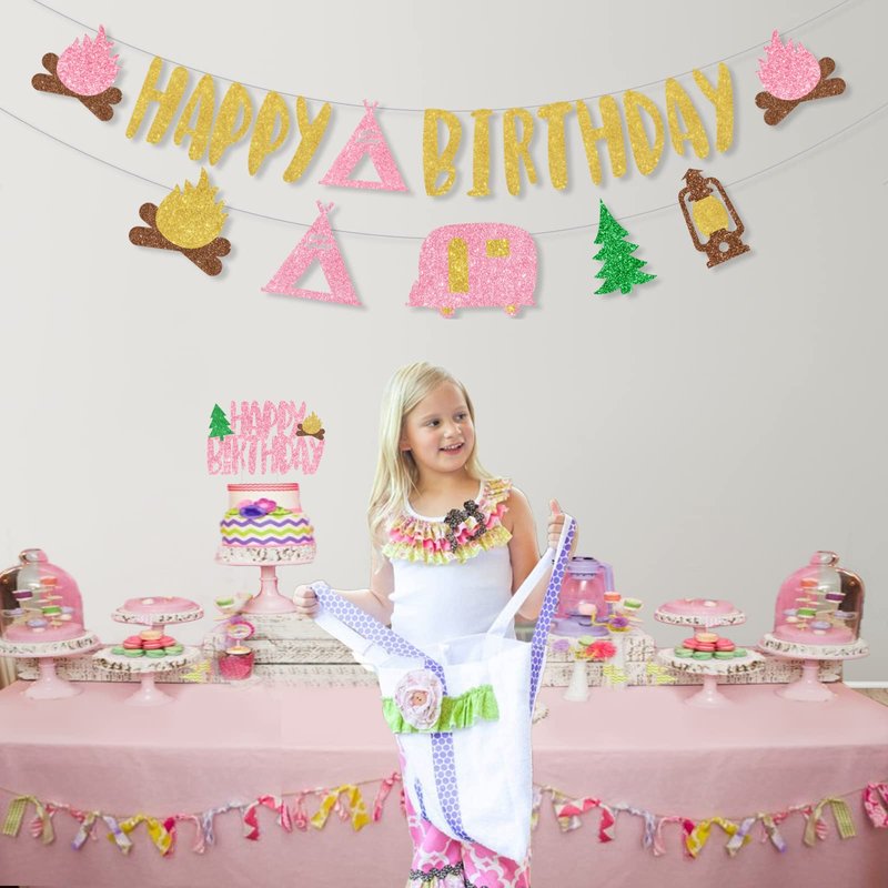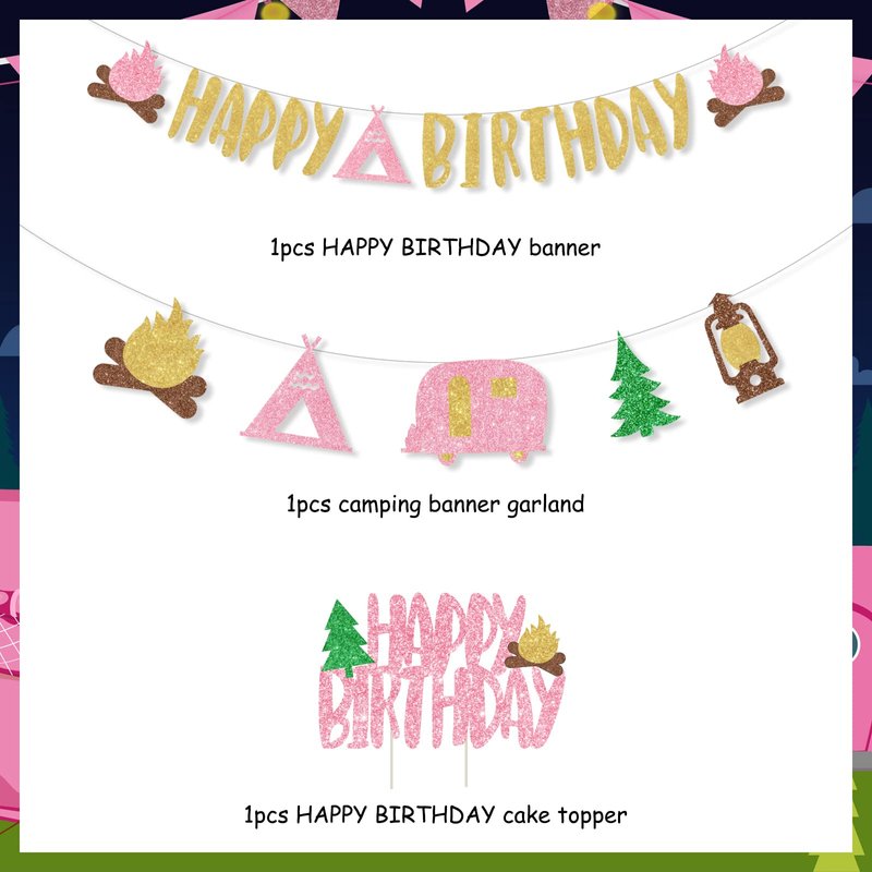 - 【Package Includes】:Camping birthday party decorations girl come with 1pcs golden and pink glitter HAPPY BIRTHDAY banner, 1pcs camping element banner garland, 1ps HAPPY BIRTHDAY cake topper