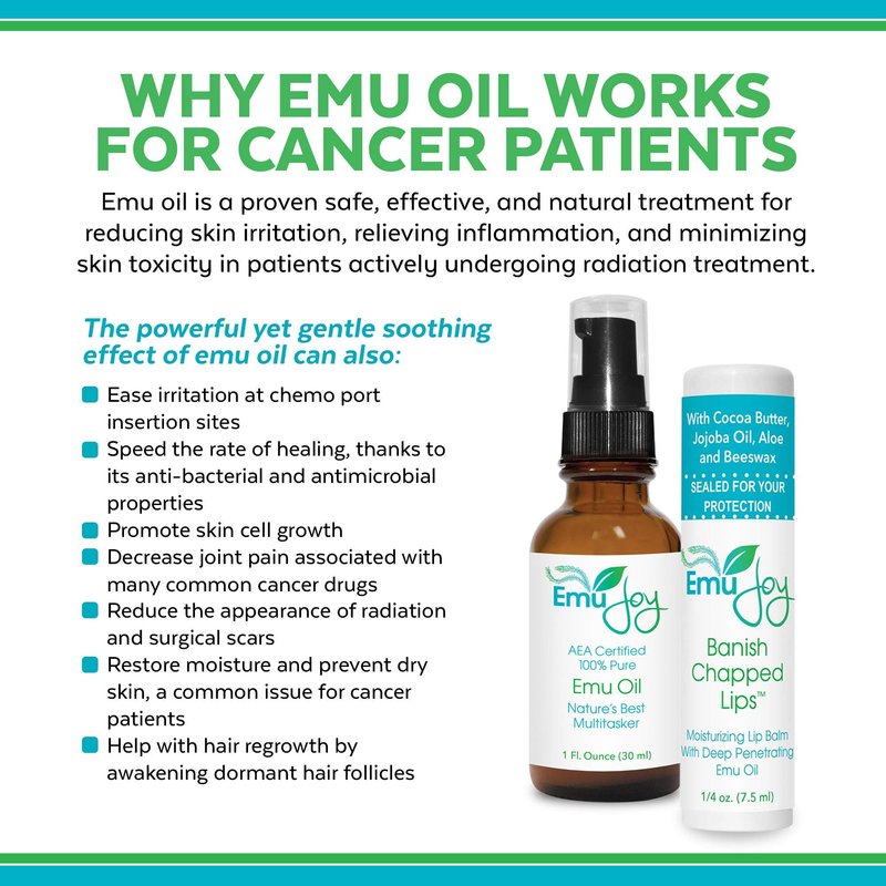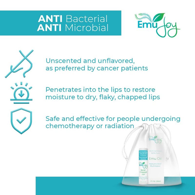 - ANTI BACTERIAL AND ANTI MICROBIAL - Emu oil is safe and effective for people undergoing chemotherapy or radiation. Our Emu oil and lip balm combo is the perfect chemotherapy care package. The oil moisturizes from within, the balm doesn't just sit on the surface like petroleum based lip balms.