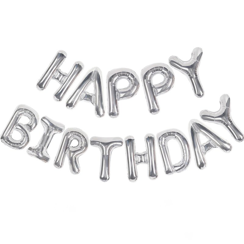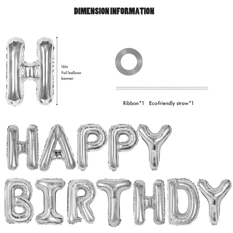 - 🎈 Package Included:16 inch Silver foil letter happy birthday balloons.Each package come with 13 pcs independent letter balloons which can be combined into "HAPPY BIRTHDAY",2 pcs straw and ribbon.