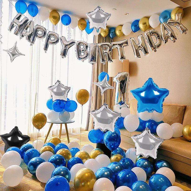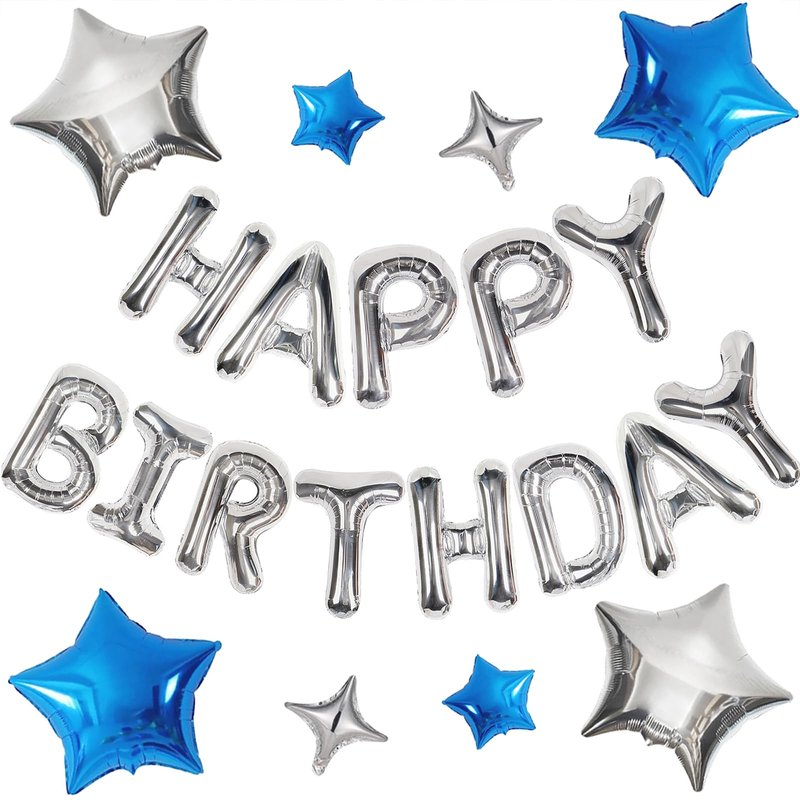 - 🎈VALUABLE PACK : Each package come with ①Silver Happy Birthday letters x13pcs(16in) ② Silver four-pointed star x2pcs (10in)③ Blue five-pointed star x2pcs (10in) ④ Blue five-pointed star x2pcs+Silver five-pointed star x2pcs (18in) ⑤Plastic straw x2pcs ⑥Ribbon x1pcs.