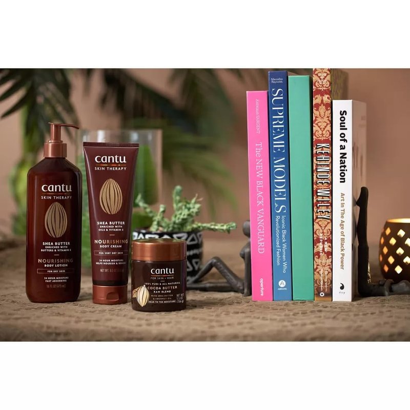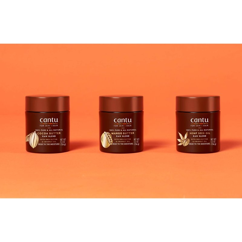 - Cantu Skin Therapy Body Raw Blends naturally soothes dry skin and moisturizes hair strands.
